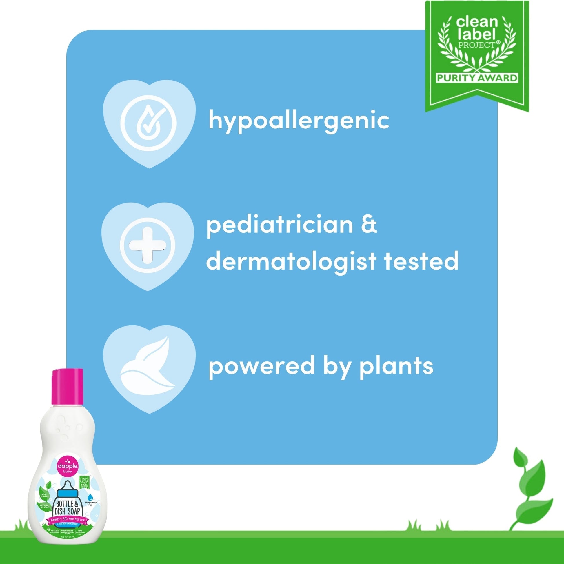 - MINDFUL INGREDIENTS: Dapple Baby Bottle & Dish Soap is a Clean Label Project Purity Award Winner for clean and pure ingredients, is pediatrician and dermatologist tested, hypoallergenic, made with plant-based ingredients and without parabens, sulfates, phthalates, mineral oil, synthetic dyes & fragrances, chlorine, alcohol, SLS, SLES, MEA, DEA, TEA.